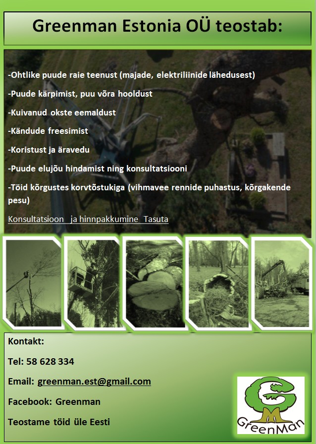 Lisainfo kuulutuses antud telefoninumbrilt või kirjutades greenman.est@gmail.com