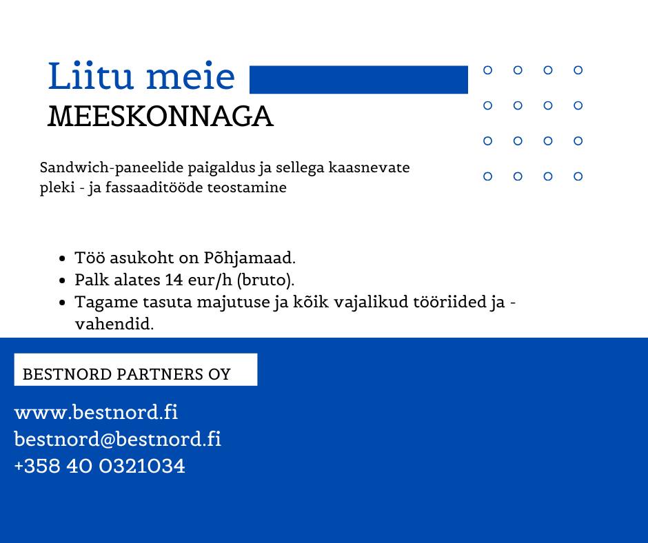 Kandidaadilt ootame eelnevat kogemust sandwich-paneelide paigalduse ja sellega kaasnevate pleki – ja fassaaditööde teostamise oskust.