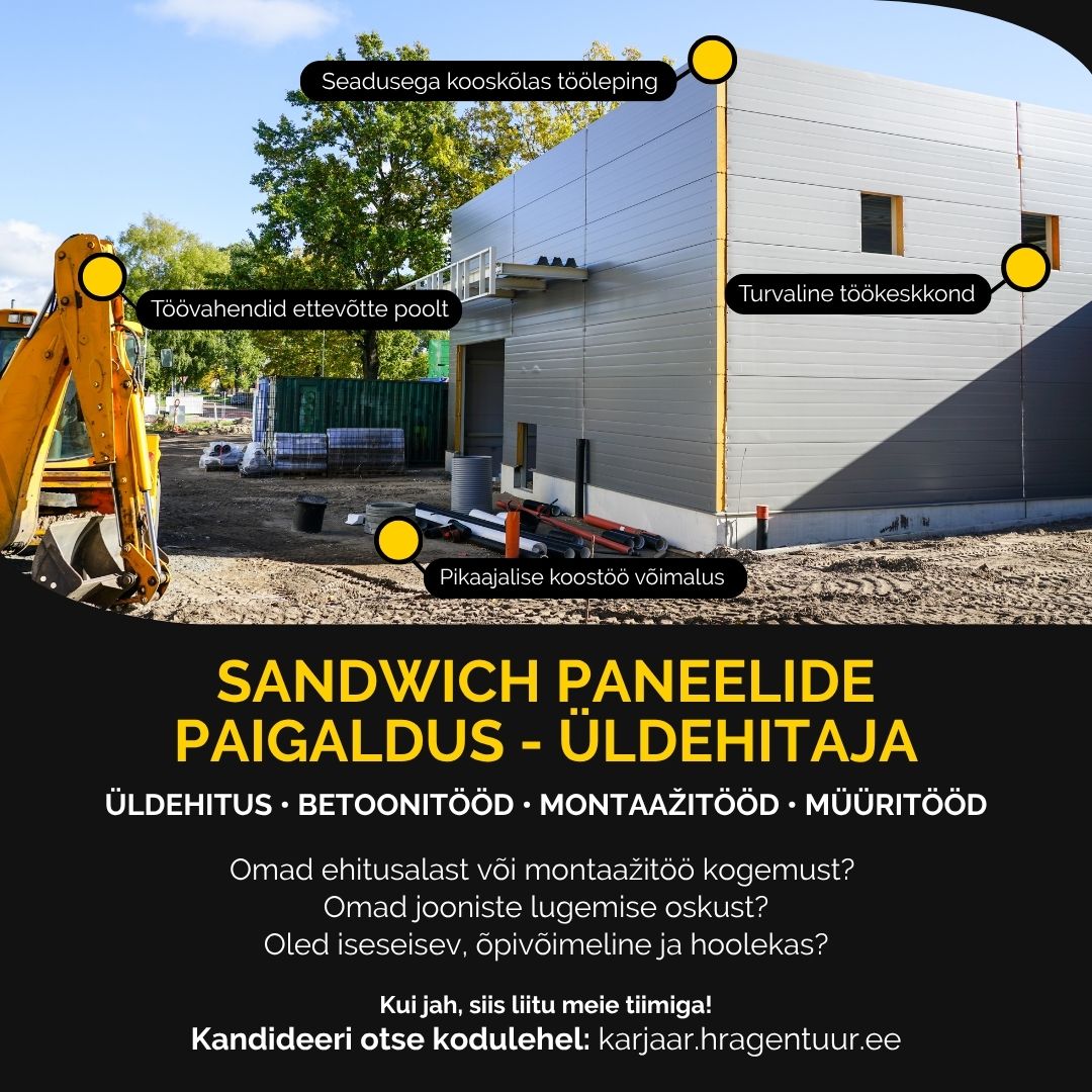 Otsime erinevatele objektidele Loo ja Jüri kandis üldehitajaid, kes püstitaksid sandwich paneelidest hooneid. Otsime töötajaid, kes suudaksid ühel objektil korraga töö algusest lõpuni viia. Positsioon nõuab varasemat üldehituse kogemust ning head töökultuuri.