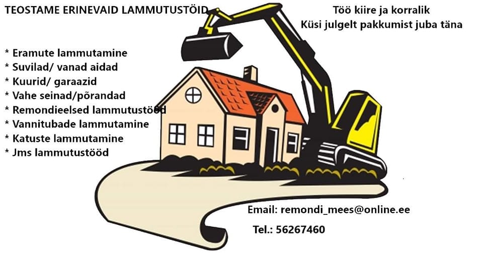 Teostame erinevaid lammutustöid! Keldrite,garaazide,kuuride koristus- ja remondieelsed lammutustööd. Ahjude,pliitide,soojamüüride,kuuride,vanade aitade,suvilate,kasvuhoonete,vannitubade,katuste,põrandate,vaheseinte, ja muud lammutustööd. Vajadusel ka prügi ära viimis võimalus. Töö kiire ja korralik. Küsi pakkumist juba täna! Töid teostan Läänemaal/Haapsalus või selle lähiümbruses Lisainfo: Email: remondi_mees@online.ee Tel: 56267460