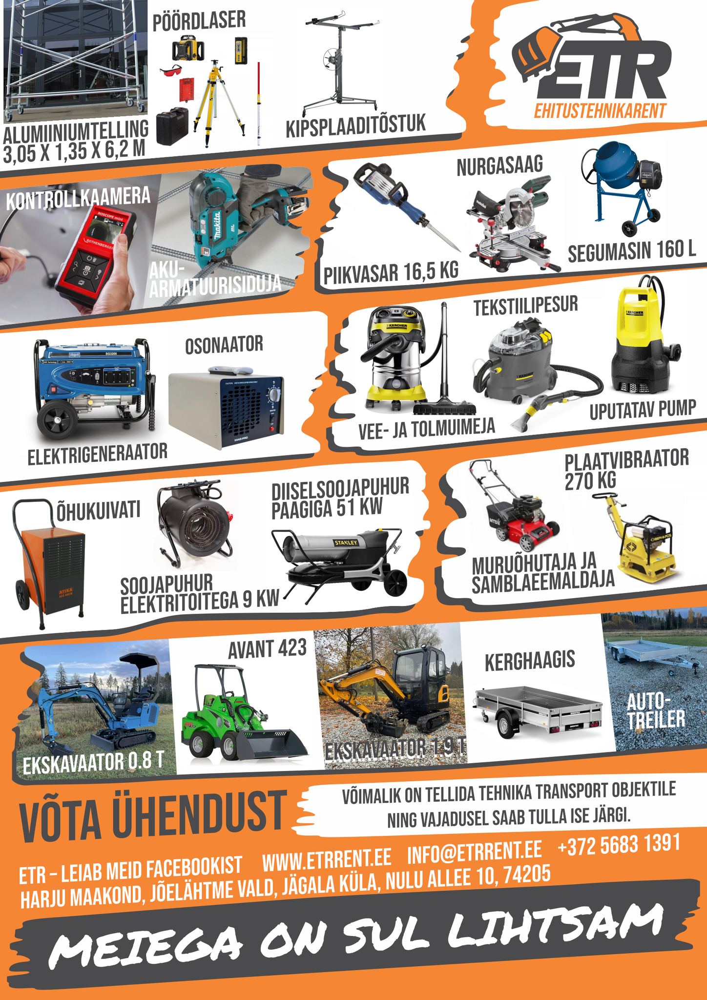 ETR OÜ on Eesti ehitustehnika rendi ettevõte, mille eesmärk on olla paindlik, usaldusväärne ja lahendusele orienteeritud koostööpartner nii era – kui ka ärikliendile.