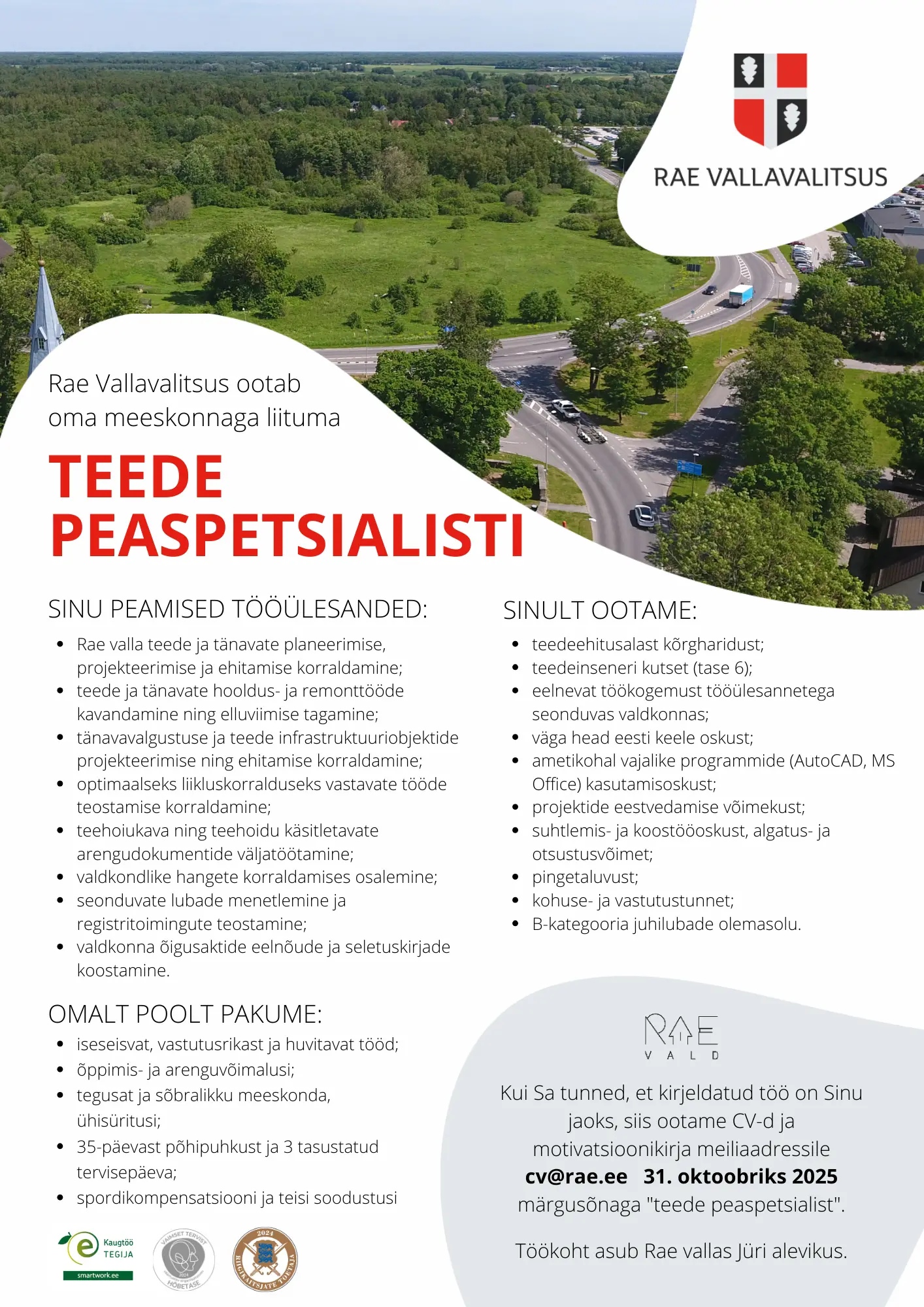 Kui Sa tunned, et kirjeldatud töö on Sinu jaoks, siis ootame CV-d ja motivatsioonikirja meiliaadressile cv@rae.ee 31. oktoobriks 2025 märgusõnaga “teede peaspetsialist”.